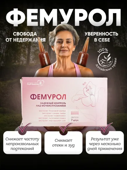 «Фемурол» — натуральные ампулы на травах для поддержки женского мочеполового здоровья. Формула помогает снизить частоту непроизвольных подтеканий, уменьшить позывы и дискомфорт. Не является лекарственным средством.